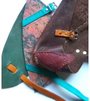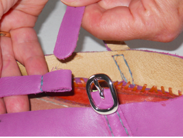 You might punch three oblong openings in your shoe and weave the strap through them, as can be seen in the photo at the beginning of this section – it’s  the orange strap woven through the teal heel piece. First skive the end of the strap, then poke it through the slots down to the edge where it can get caught in the stitching of the upper to the sole. Be sure to anchor the strip with two stitches.
