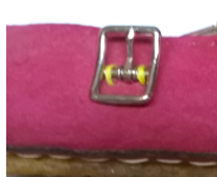 When designing a strap, plan it around the width of buckles you have. I usually cut straps just under 1/2″ wide, and use 1/2″ buckles. For a size 8 shoe I cut an 8 1/2″ long instep strap.