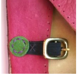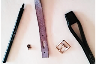 Fold the short piece of skived leather behind the longer piece, then punch four holes through both layers and stitch a cross-stitch as seen on the elastic strip, to secure the buckle.