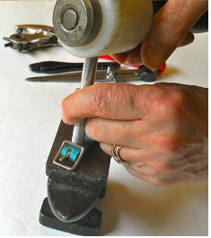 Punch a size 4 (5/32″) hole for the rivet to pass through.Interlock both pieces of the rivet through the hole, then pound the rivet with a rivet setter, struck by a maul or mallet. Or, you can smash the rivet flat – I have a piece of iron rod that is flat on both ends for pounding rivets in hard-to-reach areas.
